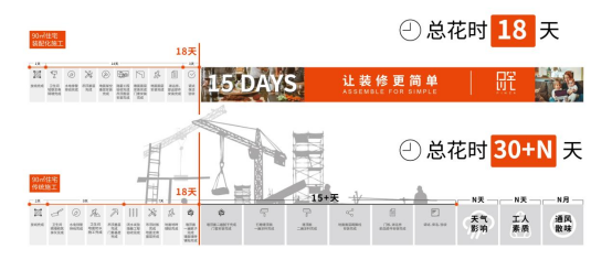 在SI体系与模块化产品技术基础上,装修施工的方式自然就演化为了装配化施工,装配化施工首先是全干法作业,脱离了对油漆工,泥瓦工地依赖,仅通过安装工与水电工就可以完成装修施工,并且是利用标准工序、标准工法、标准工具等方式进行装修施工的方法。从而实现施工周期的缩短。以品宅装饰科技的实践案例来看,装修时间能够大幅缩短30至50%。
